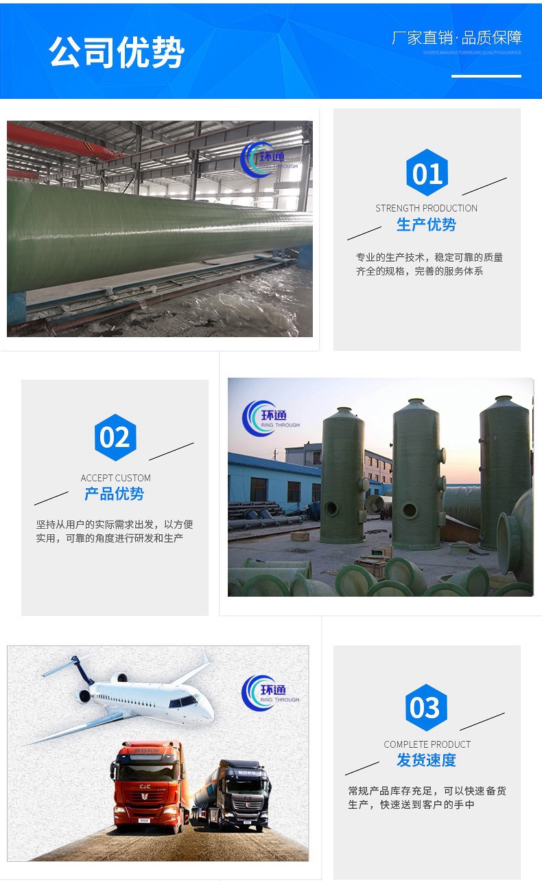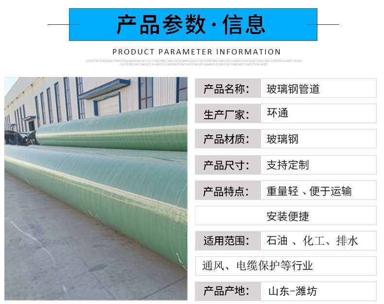 山東環通復合材料有限公司成立于2011年,是國內專業從事玻璃鋼產品的設計,研發,生產,銷售,安裝,維修服務于一體的綜合性企業。公司產品分為:玻璃鋼,玻璃鋼管,玻璃鋼管道,玻璃鋼夾砂管,玻璃鋼罐,玻璃鋼儲罐,玻璃鋼化糞池,玻璃鋼格柵,玻璃鋼脫硫塔,玻璃鋼蓋板,玻璃鋼隔油池。